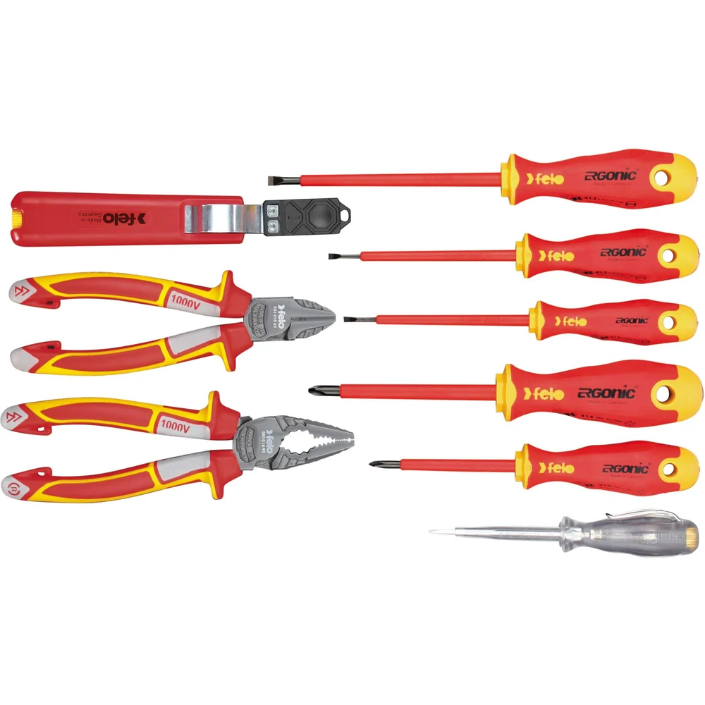 Набор диэлектрических отверток Felo Ergonic с диэлектрическими пасатижами, бокорезами, ножом для снятия изоляции и отверткой тестером сети, 9 шт 41399504 — детальное фото